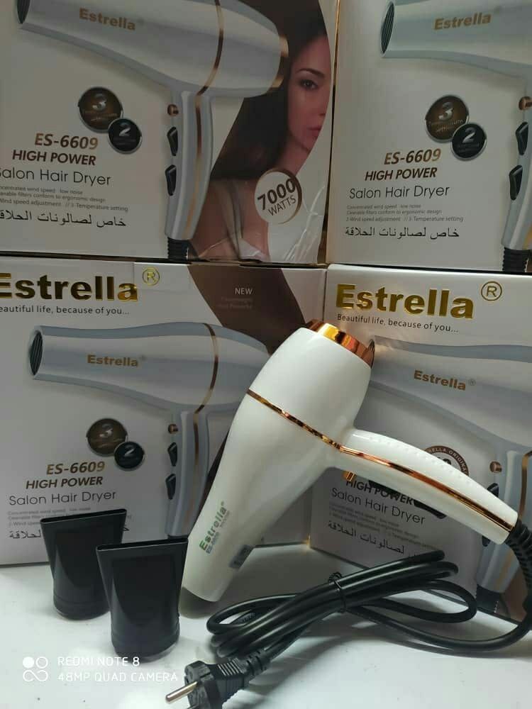سيشوار Estrella الماركة المعروفة ❤️ موديل ES-6609 المخصص للصالونات 😍 استطاعة خارقة 7000 واط 💪 ملحقان لتركيز الهواء على الشعر 🍃 إمكانية التحكم بالقوة و الحرارة 🔥 مزود بزر للتبريد الفوري ❄️ توصيل ضمن الشام وشحن للمحافظات 🚌